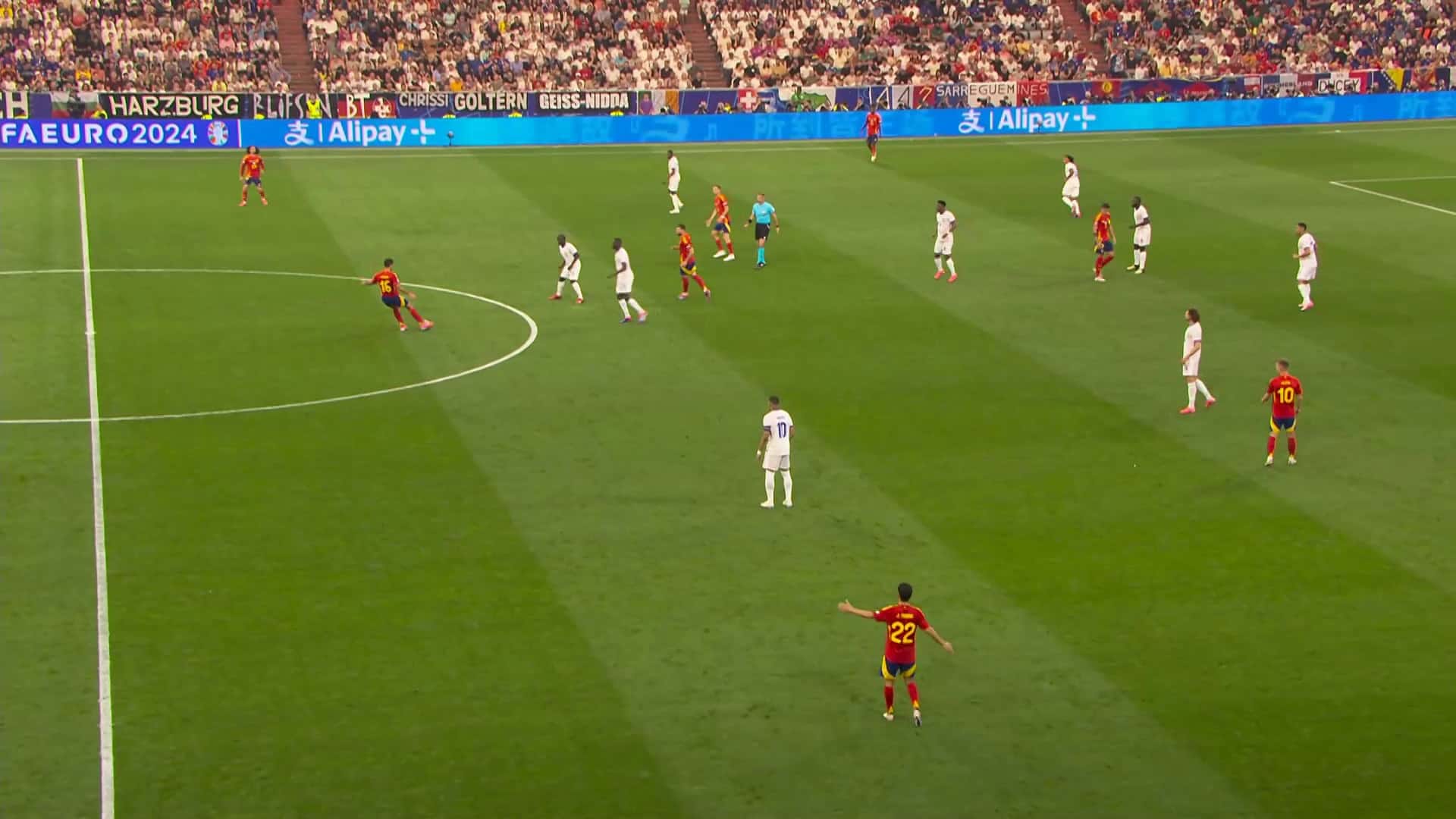 At Euro 2024, the Spaniards hardly allowed any switching moments thanks to their full-backs moving into the half-space and defensive midfielder Rodri in the centre.