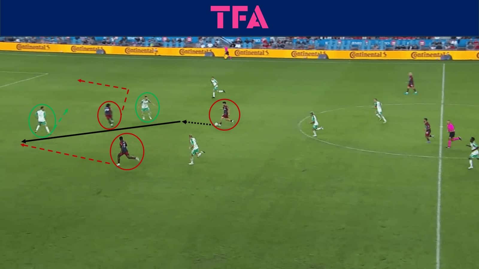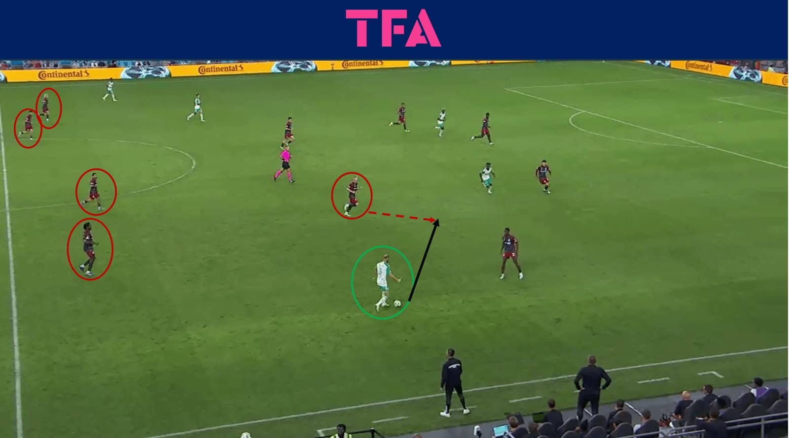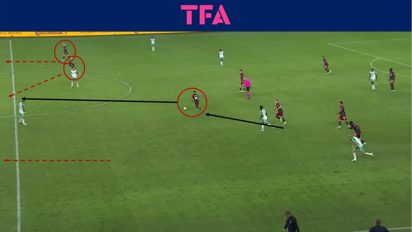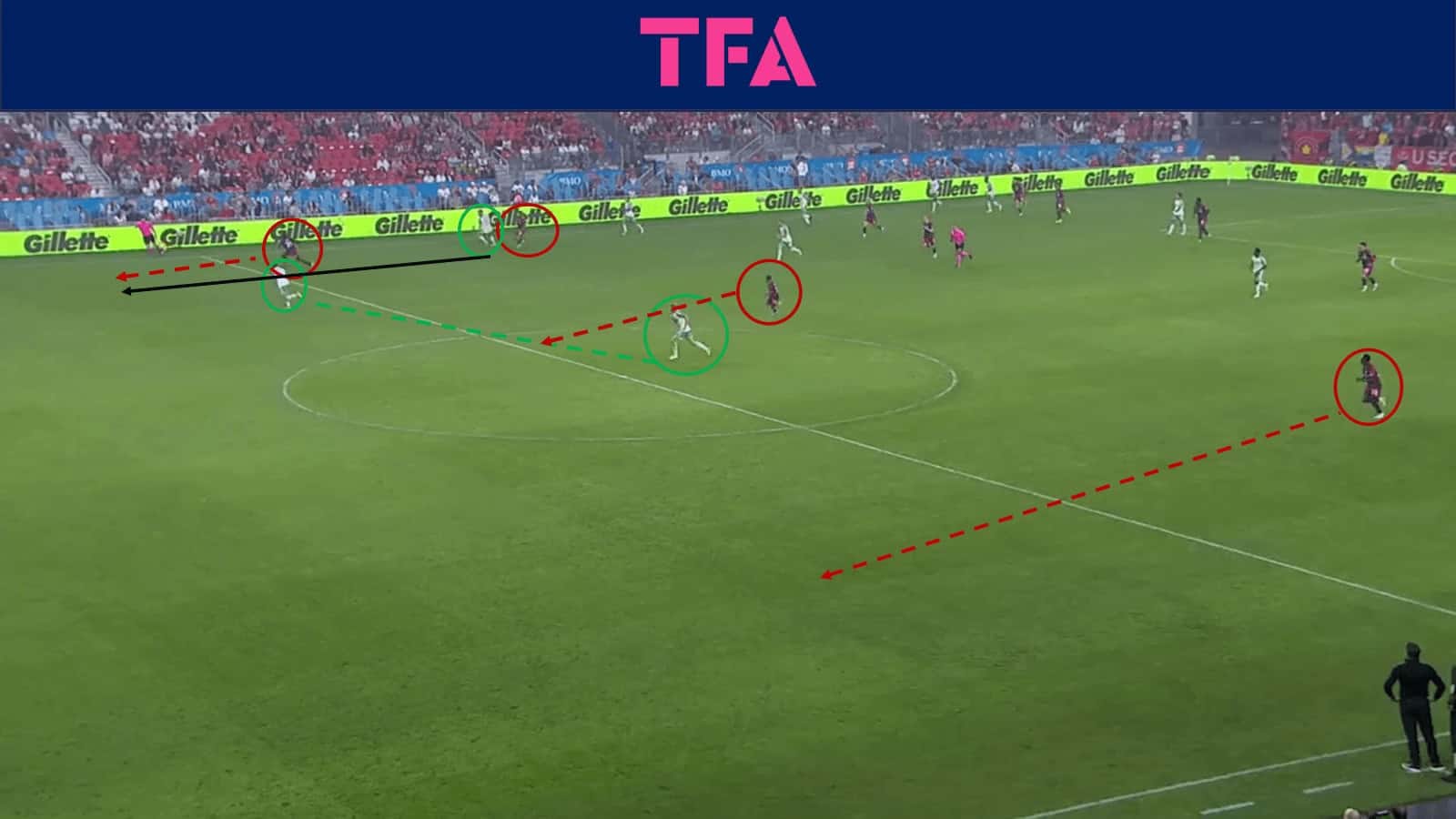 If Austin’s backline was to push up and get tight to each player, not only would this make it harder for them to keep the ball, any loss of possession could result in Toronto playing in behind them straight away.