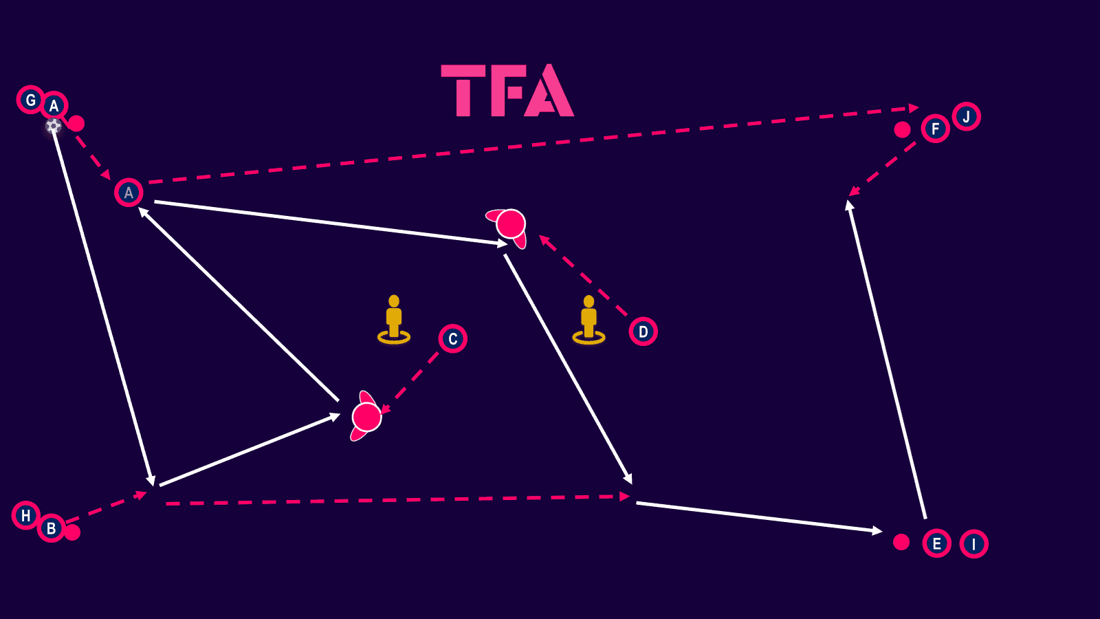 ‘A’ plays a firm pass into the second forward, who takes a touch with the inside of their back foot before quickly, with their opposite foot, switching to ‘B’.