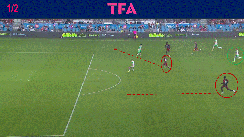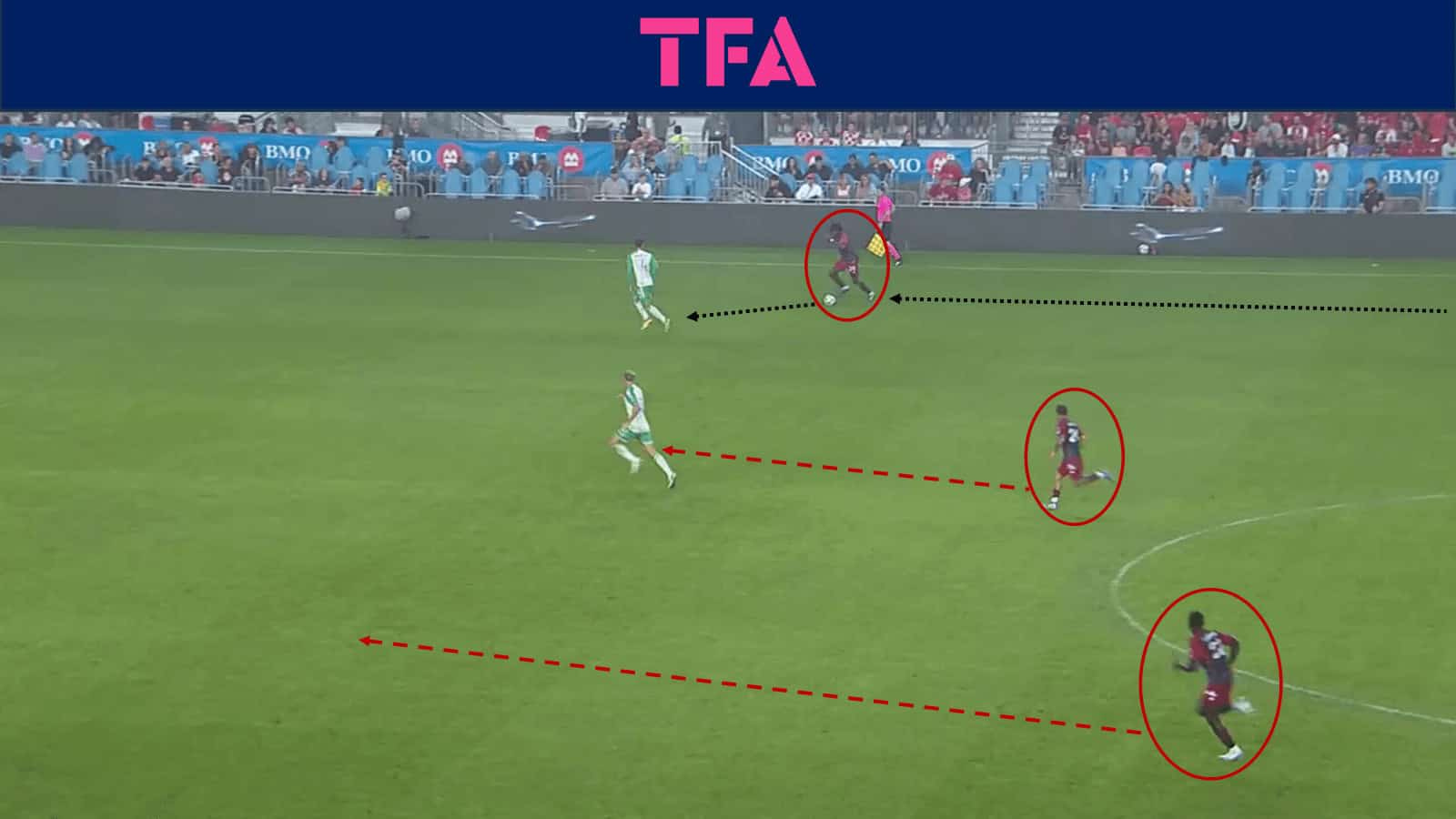 This run acts as a decoy to drag the covering defender away and give space for his teammate, Richie Laryea, on the left to run into.