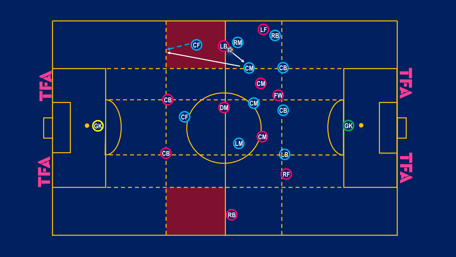 The further the defensive and midfield units are from this zone, the longer the ball will take to travel there, giving the pink team more time to react.